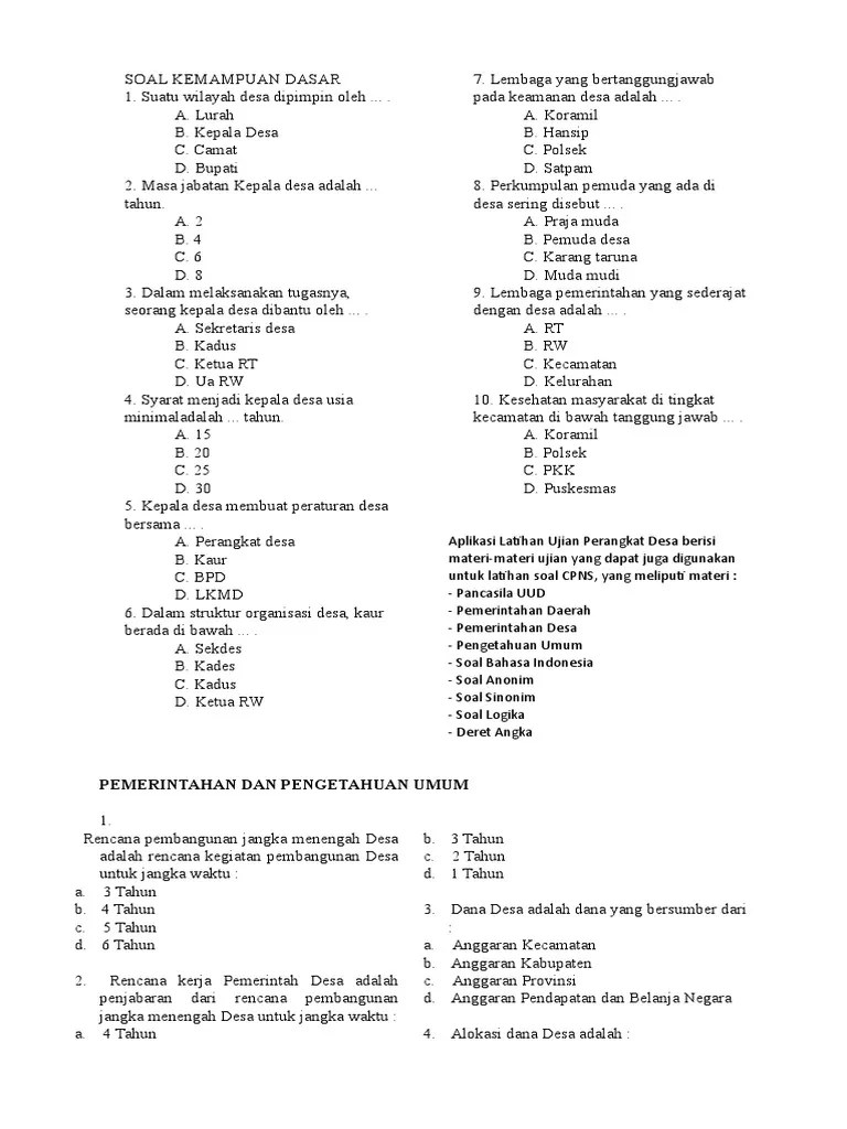 Menjadi perangkat desa selalu diidam idamkan oleh kebanyakan orang. Salah satunya adalah persiapan pemilihan tempat ujian . Berbagai persiapan ujian tulis pengisian perangkat desa di bojonegoro terus dilakukan. (2) materi soal ujian tertulis calon perangkat desa, terdiri : Pengetahuan tentang pemerintahan daerah dan pemerintahan desa; Terpilih, unnes pembuat soal ujian pengisian perangkat desa. Materi ujian penyaringan disusun dalam sistem soal pilihan berganda yang meliputi : Ujian penyaringan dibagi 2 sesi, sesi pertama adalah ujian tertulis peserta harus mengerjakan soal pilihan ganda sebanyak 100 soal dengan waktu . Perlu persiapan khusus untuk memperoleh jabatan atau posisi tersebut. Seleksi administrasi berhak mengikuti ujian tertulis. Terdapat 60 soal pilihan ganda tes perangkat desa dilengkapi dengan kunci jawaban, memudahkan para calon perangkat desa. Masa jabatan kepala desa untuk satu kali masa jabatan adalah.